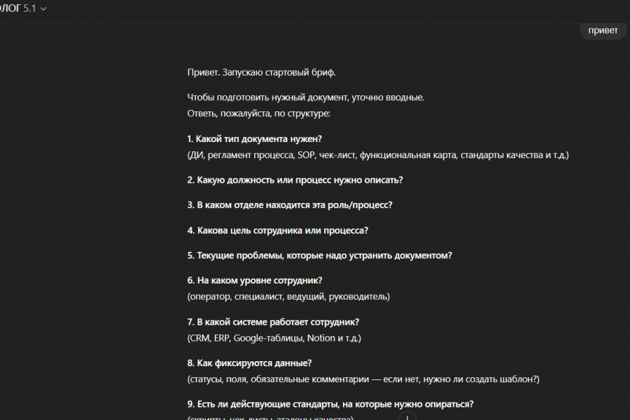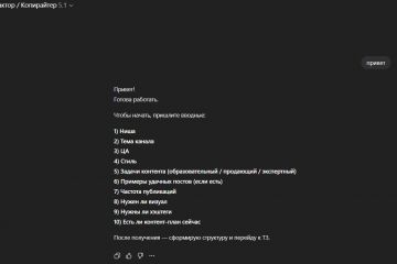 Этот GPT-агент создаётся под конкретную задачу бизнеса: скрипты, обучение сотрудников, контроль качества, текстовые материалы, работа с процессами или генерация контента.