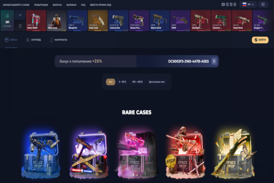 - Промокоды (на кейс, баланс, процент к депозиту).
