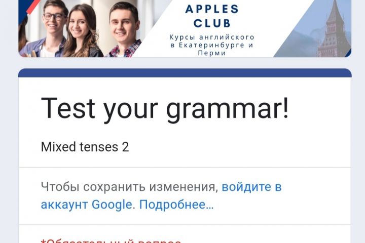 Готовый тест в формате Google test. Раздел: грамматика. Тема: mixed tenses (present simple vs present continuous; past simple vs past continuous vs present perfect; future tenses). Уровень A2 - B1.