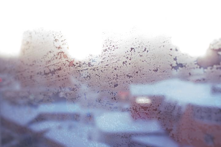 Зимние узоры на оконном стекле, за которым ранним вечером виден город