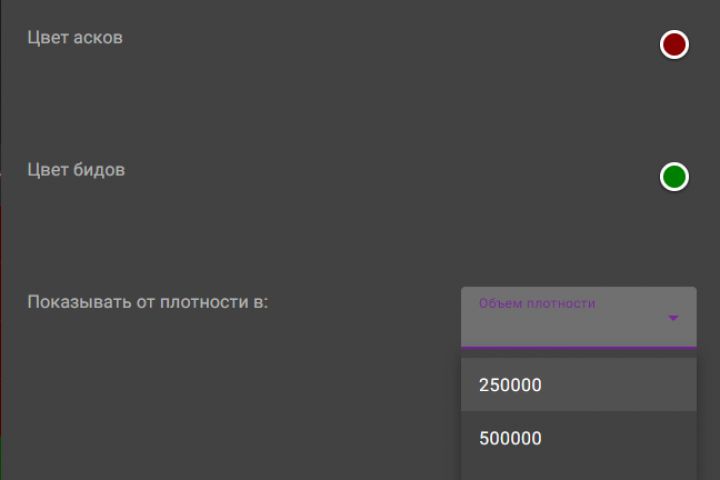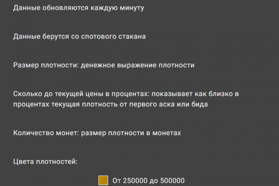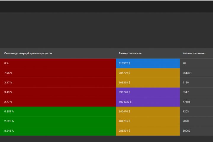 Сколько до текущей цены в процентах: показывает как близко в процентах текущая плотность от первого аска или бида