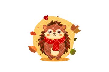 Иллюстрация. Очаровательный мультяшный ёжик в красном шарфе в окружении падающих осенних листьев.
