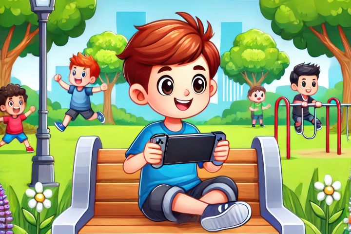 На лавочке в парке сидит мальчик с планшетом в руках.
