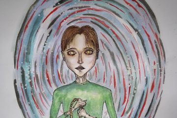 Работа выполнена в формате А5 с использованием акварели, черного линера, цветных карандашей