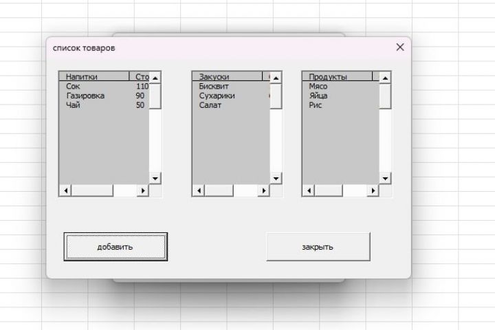 В список продуктов с помощью формы можно добавить продукты/снеки/напитки и написать стоимость (дальше они автоматически добавляются и выходит общая стоимость одной строки)