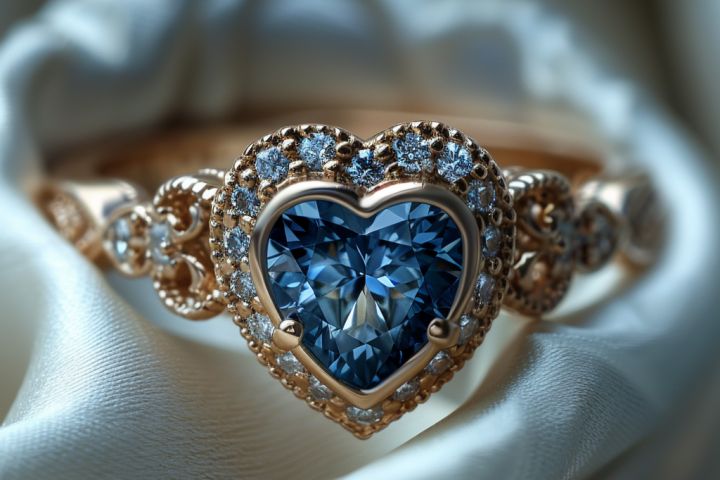 Великолепное изображение ювелирного кольца «Сердце океана» с большим сердцевидным голубым камнем, окружённым сверкающими бриллиантами. Детализированный визуал подчёркивает глубину цвета и изысканность дизайна, идеально подходит для рекламы ювелирных изделий, презентаций коллекций, визуалов в социальных сетях и интернет-магазинах. Создано нейросетью, это изображение передаёт элегантность, роскошь и магию океанской стихии