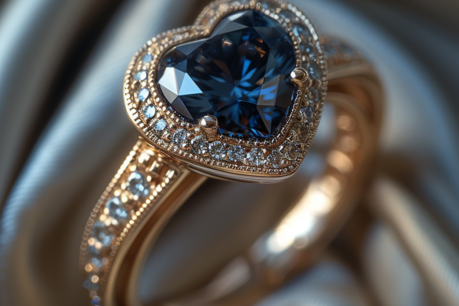 Великолепное изображение ювелирного кольца «Сердце океана» с большим сердцевидным голубым камнем, окружённым сверкающими бриллиантами Детализированный визуал подчёркивает глубину цвета и изысканность дизайна, идеально подходит для рекламы ювелирных изделий, презентаций коллекций, визуалов в социальных сетях и интернет-магазинах Создано нейросетью, это изображение передаёт элегантность, роскошь и магию океанской стихии