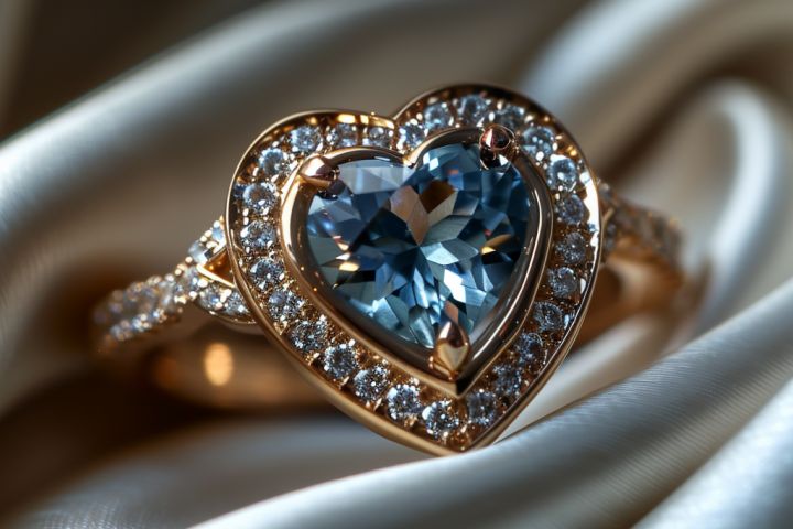 Великолепное изображение ювелирного кольца «Сердце океана» с большим сердцевидным голубым камнем, окружённым сверкающими бриллиантами Детализированный визуал подчёркивает глубину цвета и изысканность дизайна, идеально подходит для рекламы ювелирных изделий, презентаций коллекций, визуалов в социальных сетях и интернет-магазинах Создано нейросетью, это изображение передаёт элегантность, роскошь и магию океанской стихии
