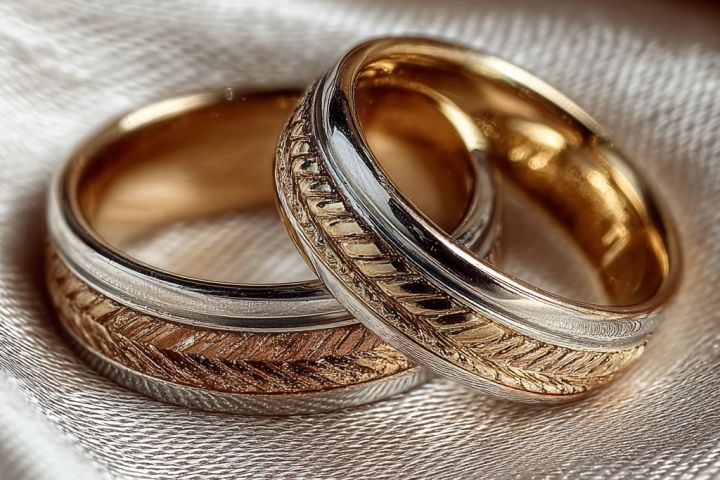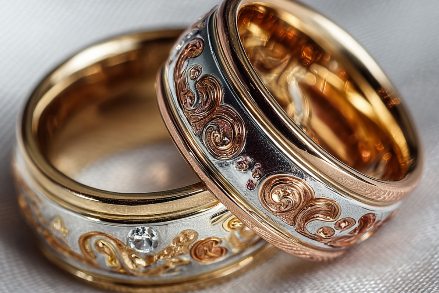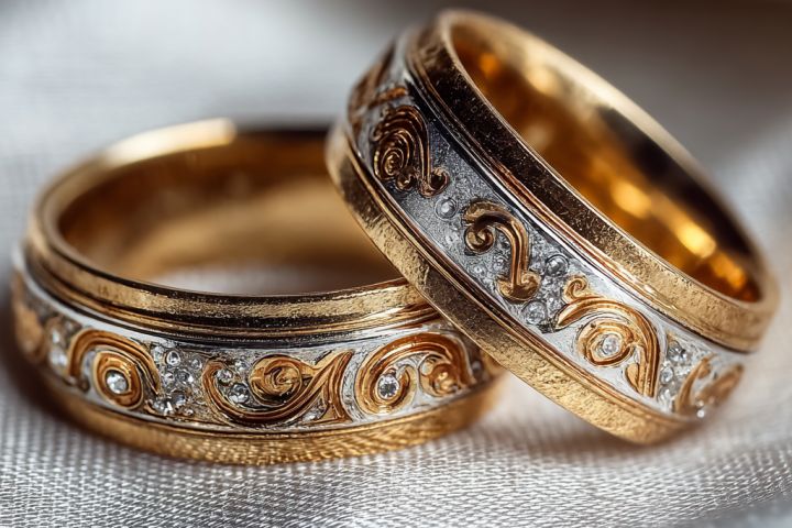 Изящное и романтичное изображение пары обручальных колец с детальной проработкой текстуры металла и мягким освещением Визуал отлично подходит для рекламы ювелирных изделий, оформления свадебных приглашений, социальных сетей, интернет-магазинов и презентаций Создано нейросетью, передаёт атмосферу любви, торжества и вечной связи