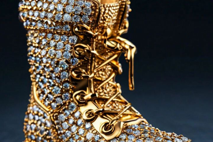 Эффектное изображение золотой подвески в виде сапога, украшенной сверкающими алмазами. Изображение передаёт изысканный блеск и высокую детализацию изделия, что делает его идеальным для использования в премиальной рекламе, каталогах ювелирных украшений, визуалах для социальных сетей, интернет-магазинов и презентаций дизайнерских коллекций. Подходит для демонстрации эксклюзивных украшений и изделий на заказ, отлично усиливает эффект роскоши и индивидуальности в рекламной подаче