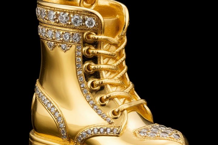 Стильное и оригинальное изображение подвески в форме золотого сапога. Изящный дизайн подчёркивает индивидуальность украшения и отлично подойдёт для использования в рекламных проектах, каталогах ювелирных изделий, визуалах для социальных сетей, витрин интернет-магазинов и презентаций. Изображение можно применить для продвижения как готовых украшений, так и услуг по изготовлению ювелирных изделий на заказ. Отлично работает на создание трендового, модного акцента в визуальном контенте