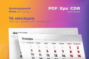 Календарный блок на 2022 год для квартального календаря А4 - 14 листов 297х145 мм (дообрезной размер 301х149 мм): 12 месяцев 2022 года + декабрь 2021 + январь 2023.