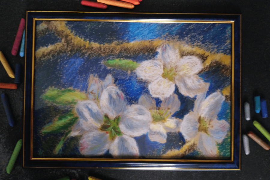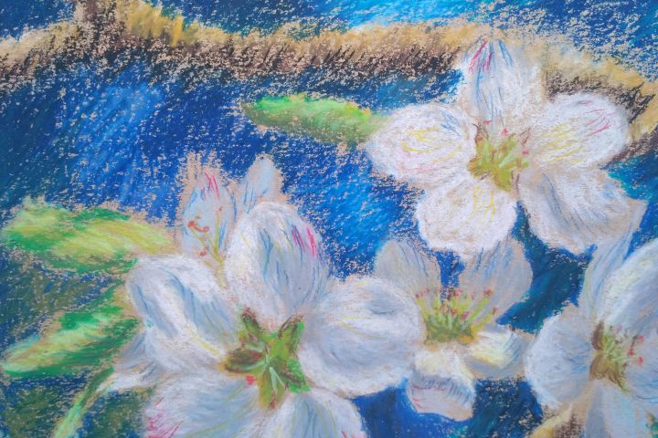 Картина в сине-голубых и белых тонах. В ней передано ощущение весны, цветения, новых надежд. Прекрасно подойдет в подарок как украшение интерьера дома или офиса. Художник: Александра Чистякова https://www.instagram.com/sasha_vishivasha_art/