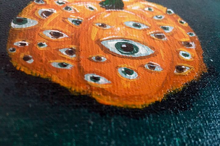 Очаровательная маленькая картина на холсте. 10х15.3 см. Изображает глазастенькую тыковку, которая с радостью будет наблюдать с Вашего рабочего стола за Вашими грехами. Больна косоглазием, но это не мешает ей быть пугающе прекрасной. Холст на картоне, акрил, покрыта лаком. В углу стоит авторская подпись.