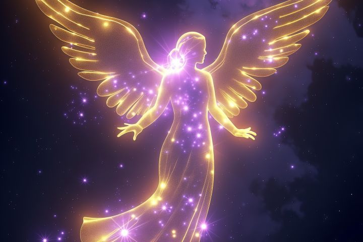 Ангел изображённый как сияющий силуэт с мерцающими контурами, вдохновлёнными звёздным светом и космической энергией. Картинка, созданная нейросетью.