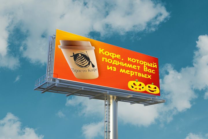 Создание key-visual для кофейни "Просто кофе", посвященного Хэллоуину, который будет привлекать внимание посетителей и информировать их о праздничной тематике заведения.