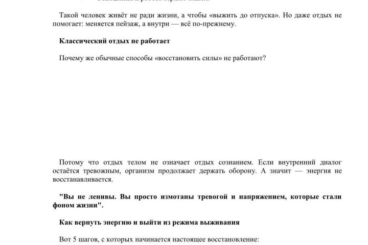В статье рассказывается о усталости души и эмоциональном выгорании. Что делать, когда усталость не уходит даже после отдыха? Как отличить эмоциональное выгорание от обычного переутомления и вернуть себе энергию? 5 шагов, чтобы выйти из режима выживания и снова начать жить, а не просто существовать.
