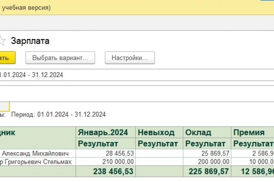 Здесь начисляется зарплата, отмечаются прогулы или невыходы на работу. Для начисления зарплаты рекомендуется перейти в Сервис - Плановые начисления, там же указать оклад и % премии. Затем по необходимости отметить прогул в соответствующем документе, далее перейти в документ "Начисление зарплаты". Есть отчёт по зарплате.