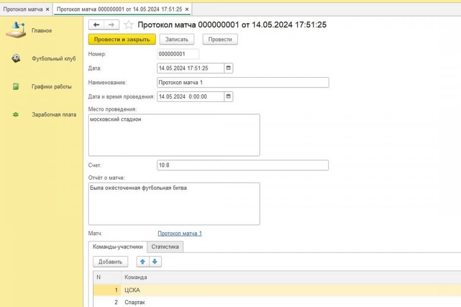 Состоит из 3 разделов: Футбольный клуб, Графики работы, Заработная плата.