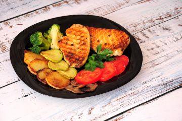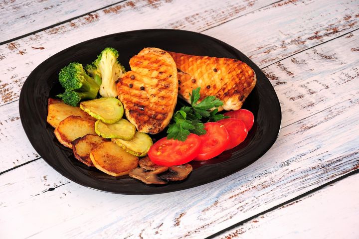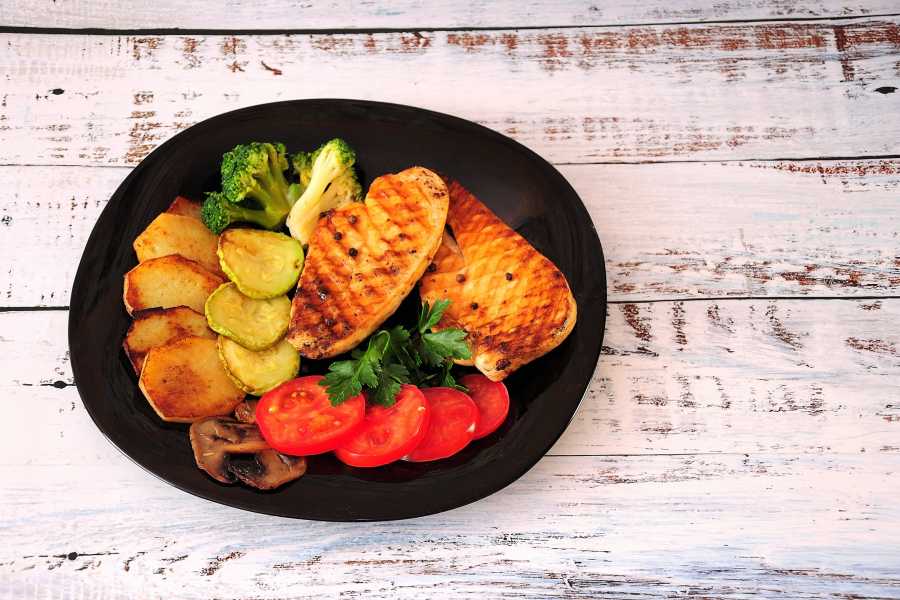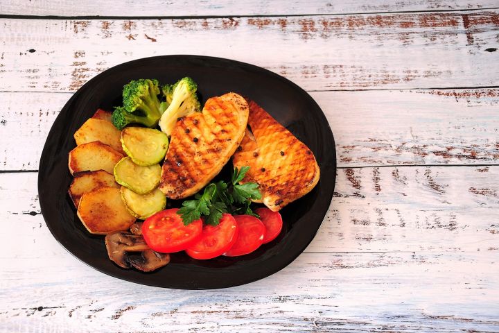 Тарелка с жареным на гриле куриным филе, с картофелем, грибами, брокколи и томатом на деревянном столе.