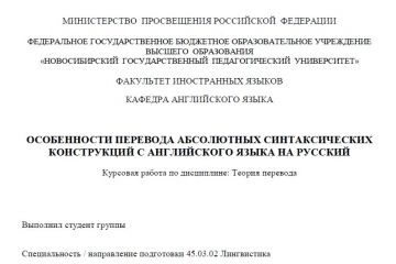 Тема: ОСОБЕННОСТИ ПЕРЕВОДА АБСОЛЮТНЫХ СИНТАКСИЧЕСКИХ КОНСТРУКЦИЙ С АНГЛИЙСКОГО ЯЗЫКА НА РУССКИЙ