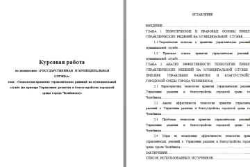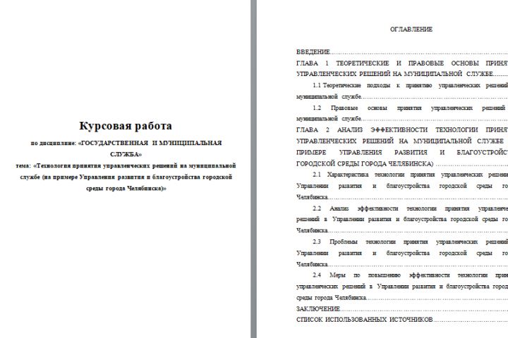 Технология принятия управленческих решений на муниципальной службе (на примере Управления развития и благоустройства городской среды города Челябинска). Эффективность системы государственной гражданской и муниципальной службы напрямую зависит от качества принимаемых управленческих решений, которые, являясь неотъемлемой частью деятельности данной системы, определяют её результативные параметры и содержание функционирования системы управления в РФ. Место защиты - Финансовый университет при Правительстве РФ, оценка - 5 (100 баллов).
