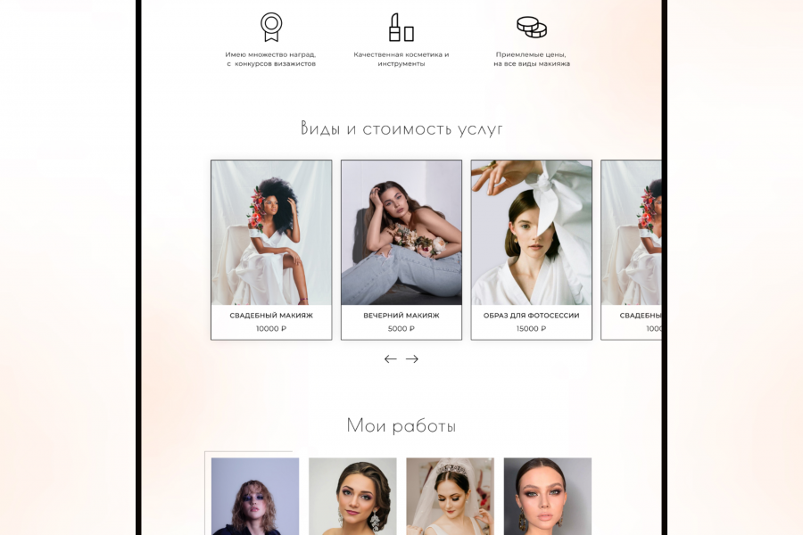 Лендинг для визажиста, имеющий десктопную и мобильную версию. Выполнен в минималистичном стиле, легкий для восприятия.