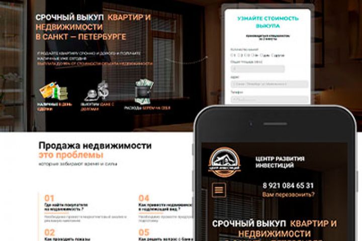 Лэндинг по выкупу недвижимости и квартир. Сайт без проблем редактируется без знаний программирования! Сайт имеет адаптивную верстку под планшет и телефон.