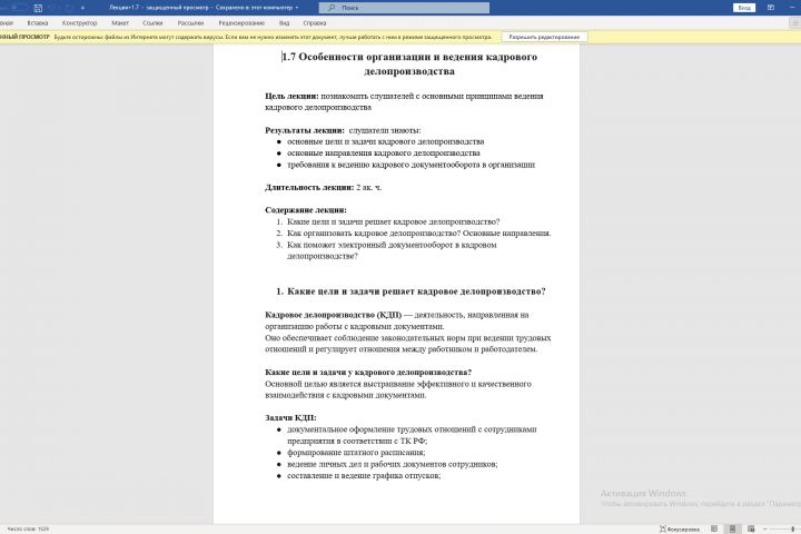 Цель лекции: познакомить слушателей с основными принципами ведения кадрового делопроизводства