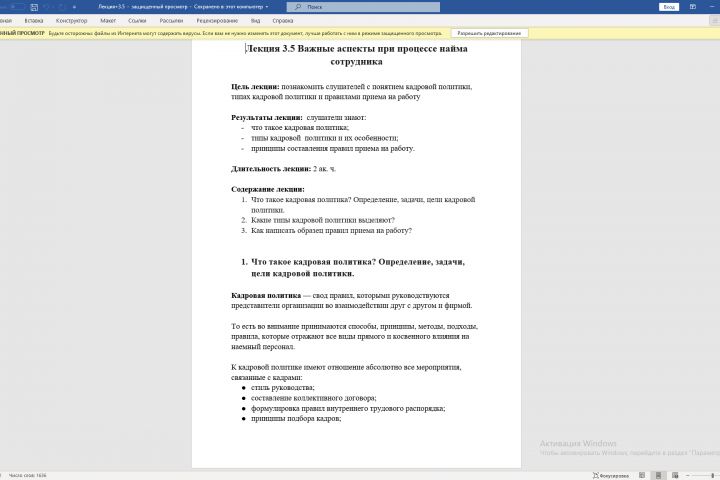 Цель лекции: познакомить слушателей с понятием кадровой политики, типах кадровой политики и правилами приема на работу