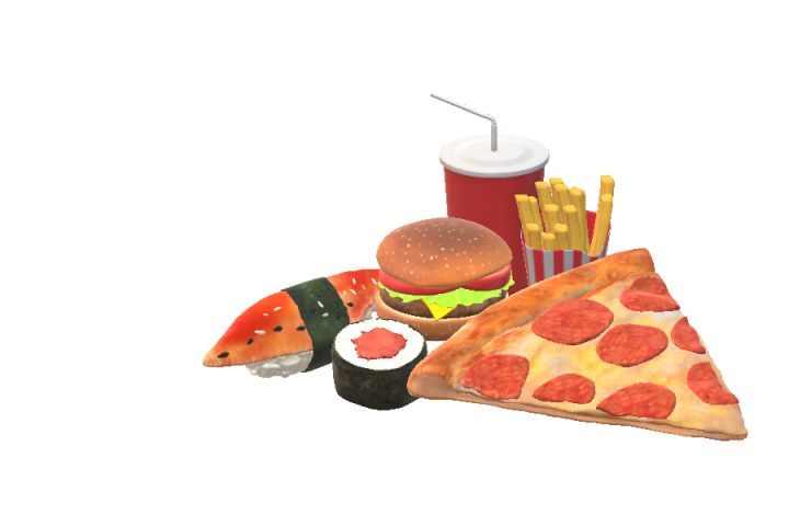 3D модель: пицца ,ролл, бургер, суши, картофель фри, напиток.