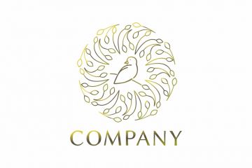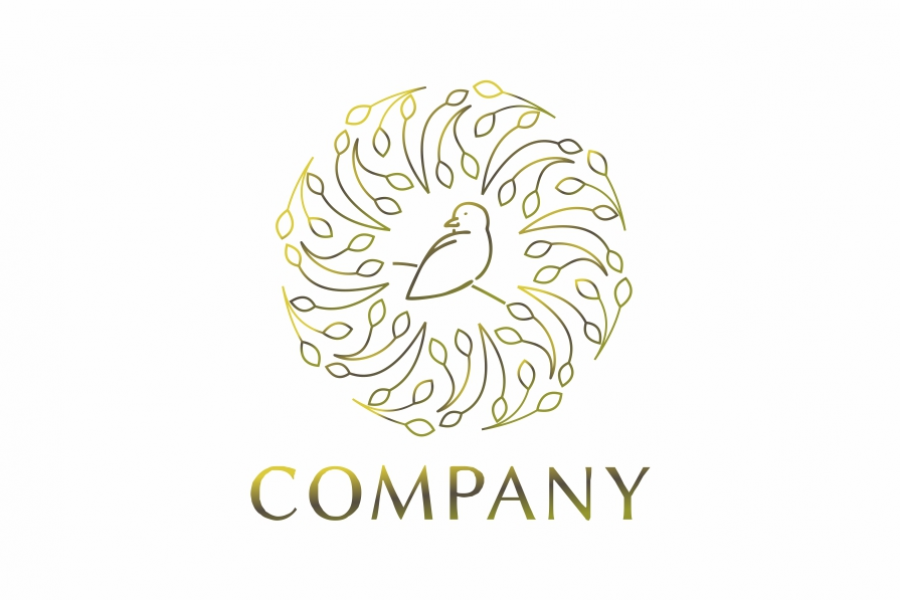 Логотип изображающий птицу, сидящей на ветке среди листьев.
