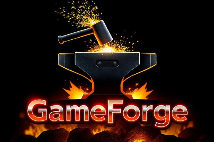 В центре дизайна изображена светящаяся кузнечная наковальня, по которой ударяет молот, создавая искры, которые превращаются в пиксельные частицы.