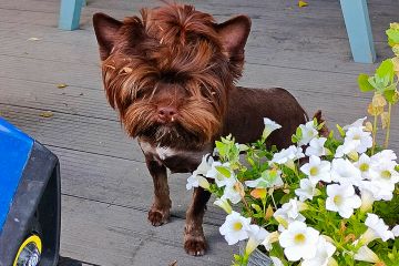 Порода декоративных собак Йоркширский терьер коричневого цвета с цветами петуньями