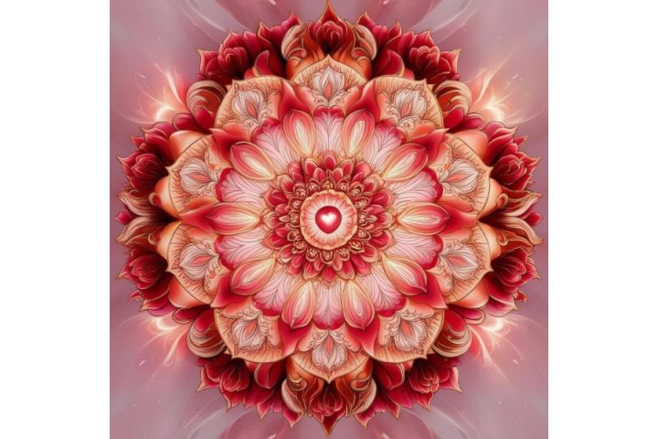 Лучистая и сияющая оттенками красного, розового и золотого, эта мандала воспламеняет страсть и желание. Позвольте ей творить свою «магию» и преображать вашу реальность.