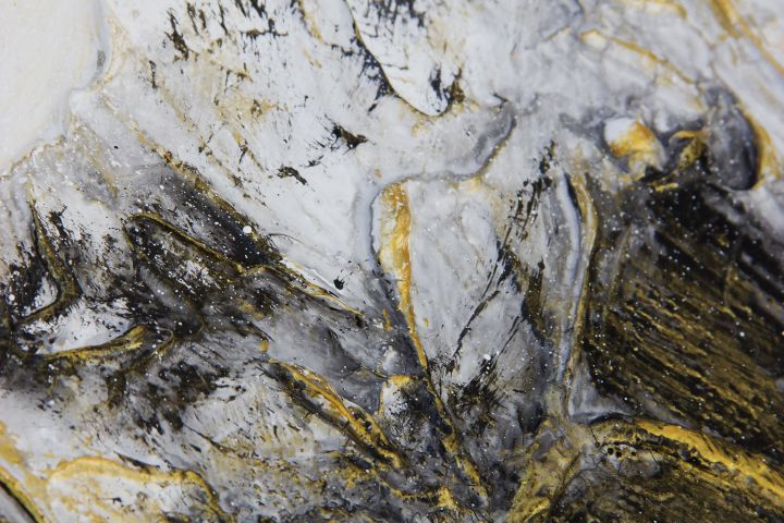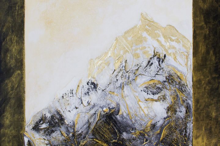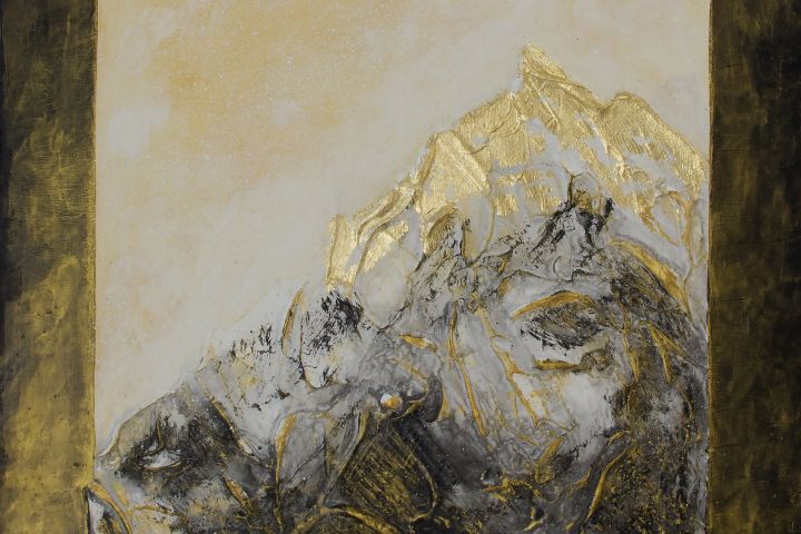 Интерьерная картина "МаунтИнн" создана с применением кварцевого песка, акриловой текстурной пасты, акриловых красок и потали. Рельеф выражен ярко, покрыт золочением и поталью. На некоторых местах образовалась естественная кракелюрная сетка.