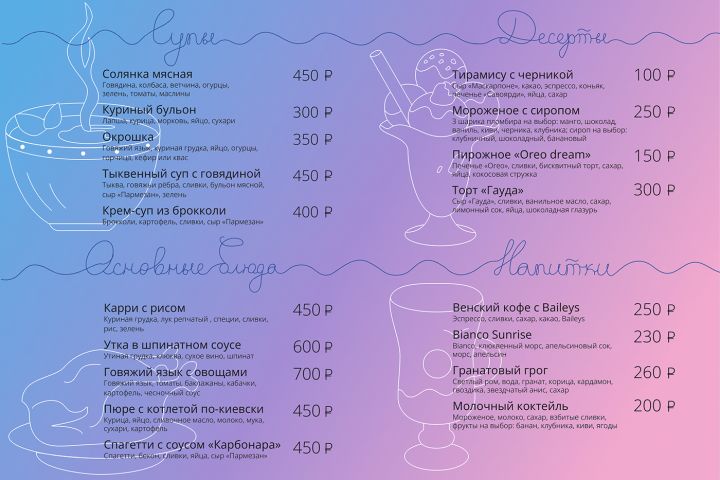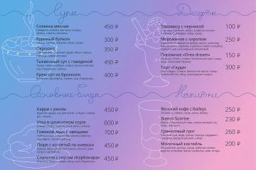Нежное, атмосферное меню из четырех страниц. Готовый концепт меню подойдет для баров, кафе, ресторанов. Сделан в векторном формате (Adobe Illustrator).