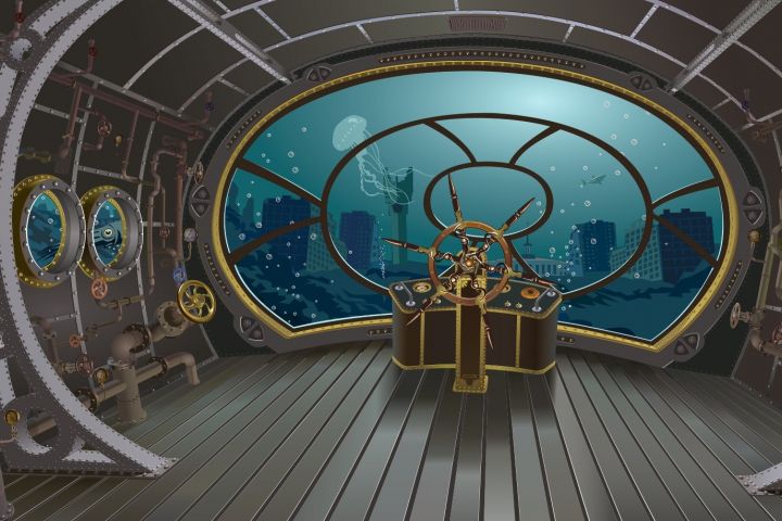 Работа выполнена в векторе. Отлично подойдёт для фотообоев, можно увеличить до любых размеров без потери качества. По желанию покупателя можно поменять подводный пейзаж за окном. Картинка была сделана на заказ, но оказалась не востребована. (картинка обрезана модератором)