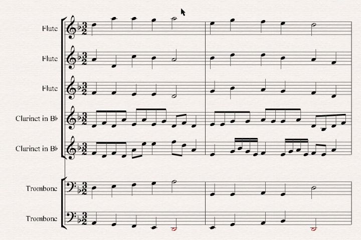 3 флейты, 2 кларнета, 2 тромбона. Нот для ударной установки нет, но по аудиозаписи ударник может и подобрать, там ничего сложного. Обработка авторская. Аудио запись живого исполнения имеется.