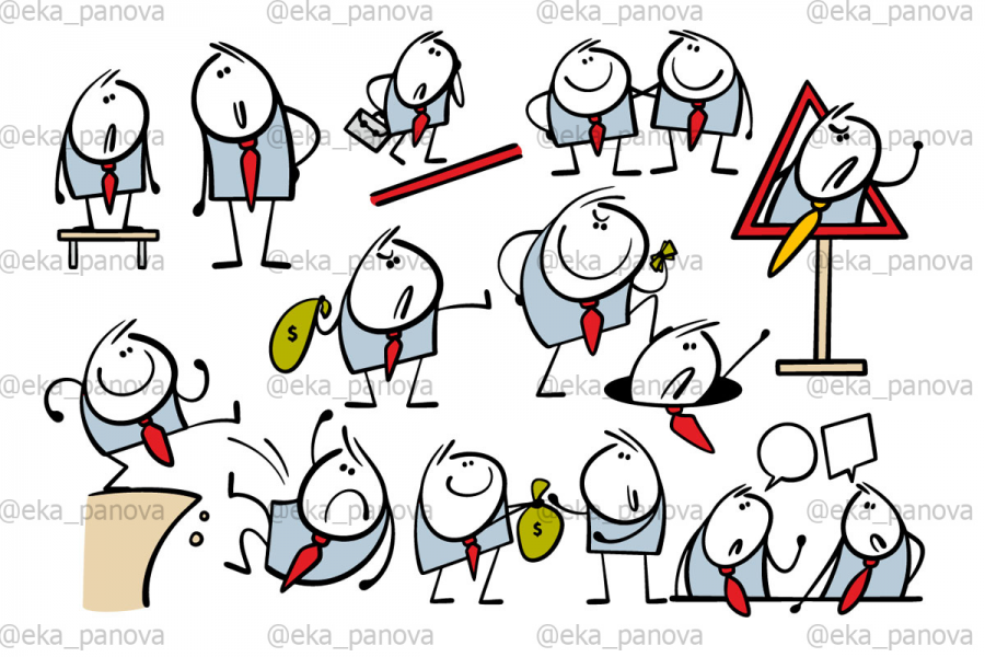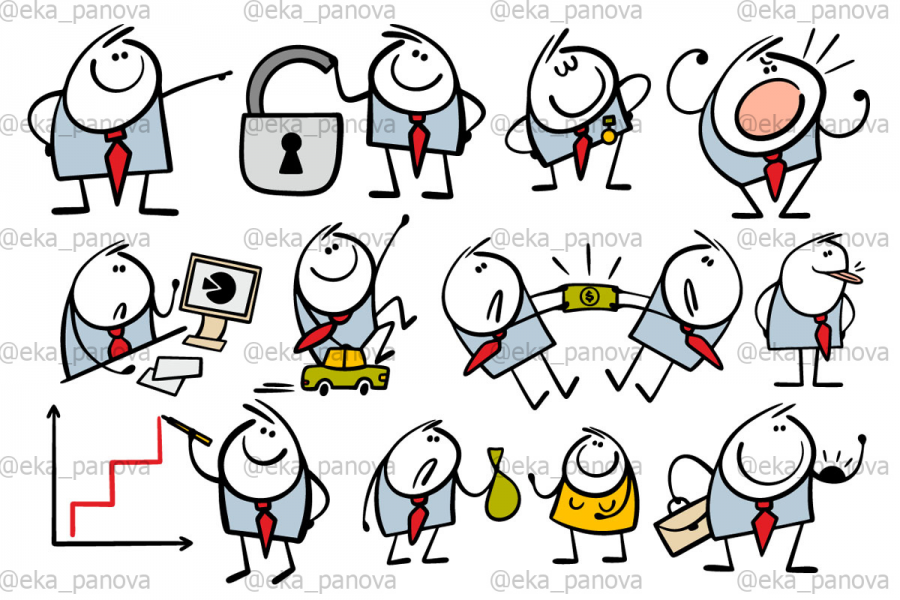 Мультяшные персонажи в деловых костюмах, находящиеся в различных жизненных ситуациях на работе и дома. Бизнес-концепции, связанные с достижением целей, успехом или неудачами. Темы финансовой безопасности, взаимодействия с коллегами и создания команды мечты. Смелые руководители и подчиненные, офисные работники. А также деньги, финансовые возможности и банковская сфера.