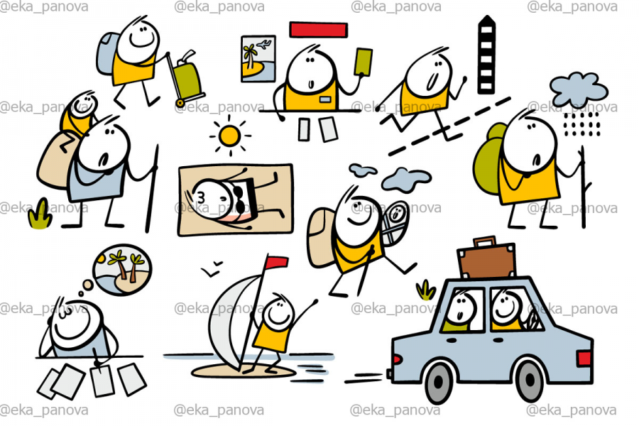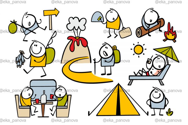 Все, что связано с туризмом и путешествиями. Мужчины, женщины и даже дети отправляются в поход, устанавливают палатки, готовят еду на костре, купаются в реке или покупают путевки и улетают в теплые страны. Туристическое агентство обеспечит отличный отдых, главное — не опоздать на свой рейс!
