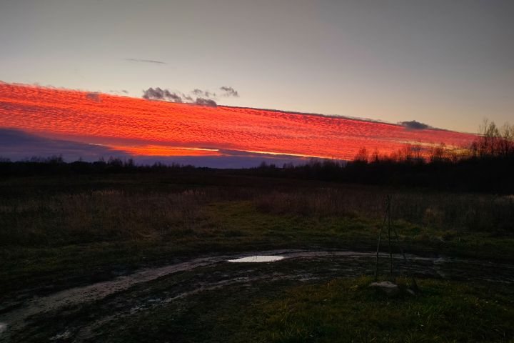 Продаю: Необычный осенний закат в деревне над лесом и лужами
