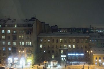 Вид сверху на соединение старого петербургского дома и многоэтажного здания, прохожие бегут по зимнему тротуару.