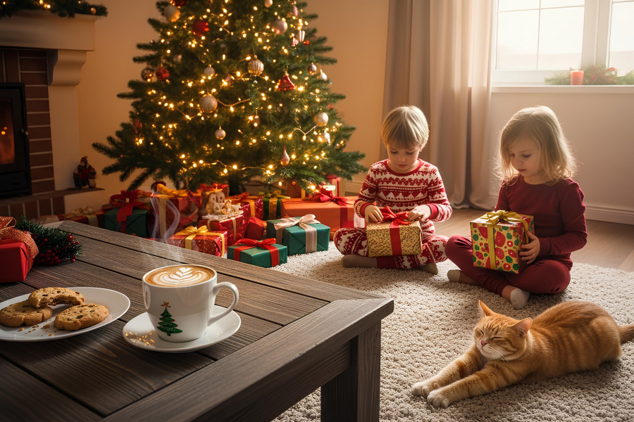 Тёплая уютная новогодняя сцена: на мягком светлом ковре сидят мальчик и девочка около пяти лет и готовятся открыть праздничные подарки. Рядом сияет нарядная ёлка с множеством разноцветных коробок под ней, а в камине мягко горит огонь. На переднем плане — чашка кофе и надкусанное печенье, создающие атмосферу домашнего уюта. Рядом с детьми, растянувшись на ковре, мирно дремлет рыжий кот. Идеальная иллюстрация для праздничного контента, открыток и атмосферного новогоднего оформления.