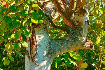 Необычно срубленная береза ранней осенью с желтыми листьями