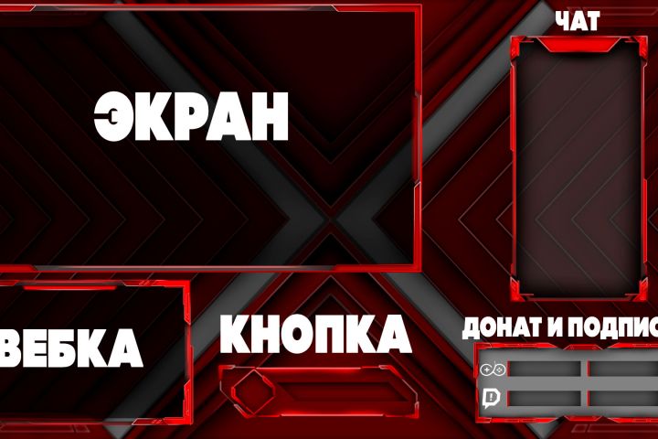 Полное оформление для твич канала. Сюда входит: Анимированный оверлей для веб камеры, оверлей для экрана, переход, анимационная заставка, оверлей для чата, кнопки.