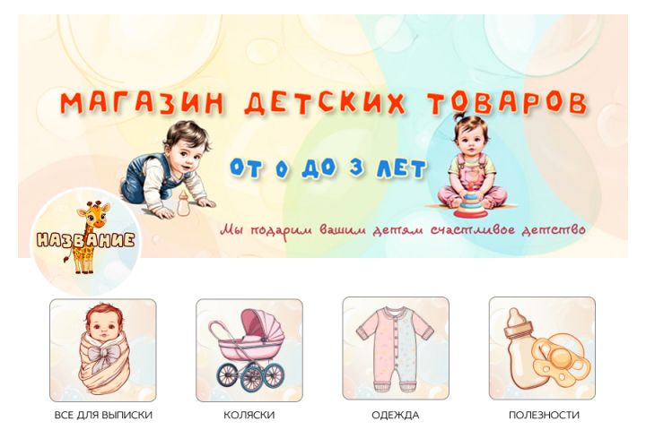 Дизайн магазина детской одежды в ВК включает: - обложку - аватар - кнопки: Все для выписки, Коляски, Одежда, Полезности. Все оформление уникально, создано с помощью нейросети и приложения Figma. Исходники предоставлю.