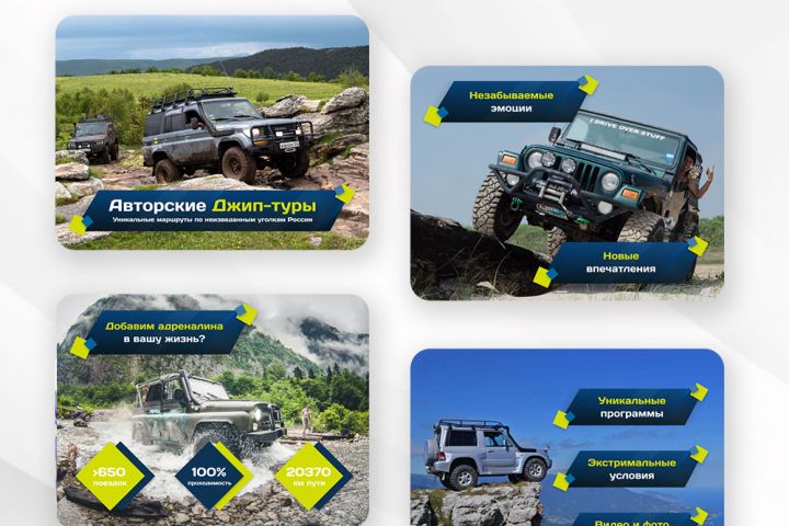 Всего 6 красочных баннеров, где выделены основные преимущества путешествий на внедорожниках. Отлично подойдут для авторских туров по Кавказу, Крыму, Алтаю, Байкалу и т.д. Баннера подходят для размещения в социальных сетях, а также для выделения объявления, например, на Авито. Ваши услуги заиграют новыми красками и будут 100% выделяться среди конкурентов☝🏻 При необходимости готова доработать макеты⚡