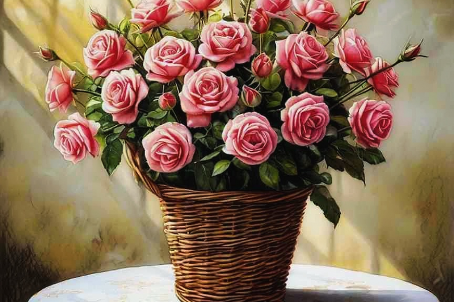 Праздничная открытка с букетом роз и текстовым поздравлением к Международному женскому дню. Изображено создано с использованием нейросетей и графических редакторов