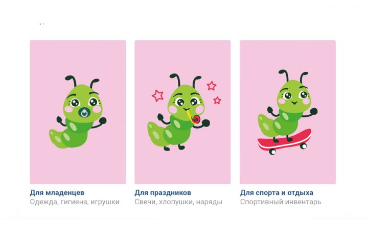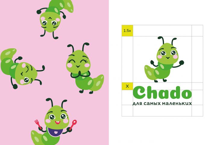 Изначально я его разрабатывала для детской тематики. Я задалась вопросом: какое существо передает идею детства? Мне пришла идея гусеницы, которая, взрослея, превращается в бабочку. Округлая графика и аналогичные цвета позволили сделать гусеницу доброй и привлекательной. У гусеницы невозможно определить пол: она коммуницирует и с мальчиками, и с девочками. Зелёный символизирует безопасность, рост и развитие. Так как я выбирала приглушенные оттенки, цветовая палитра получилась умеренно красочная, но не пестрящая.